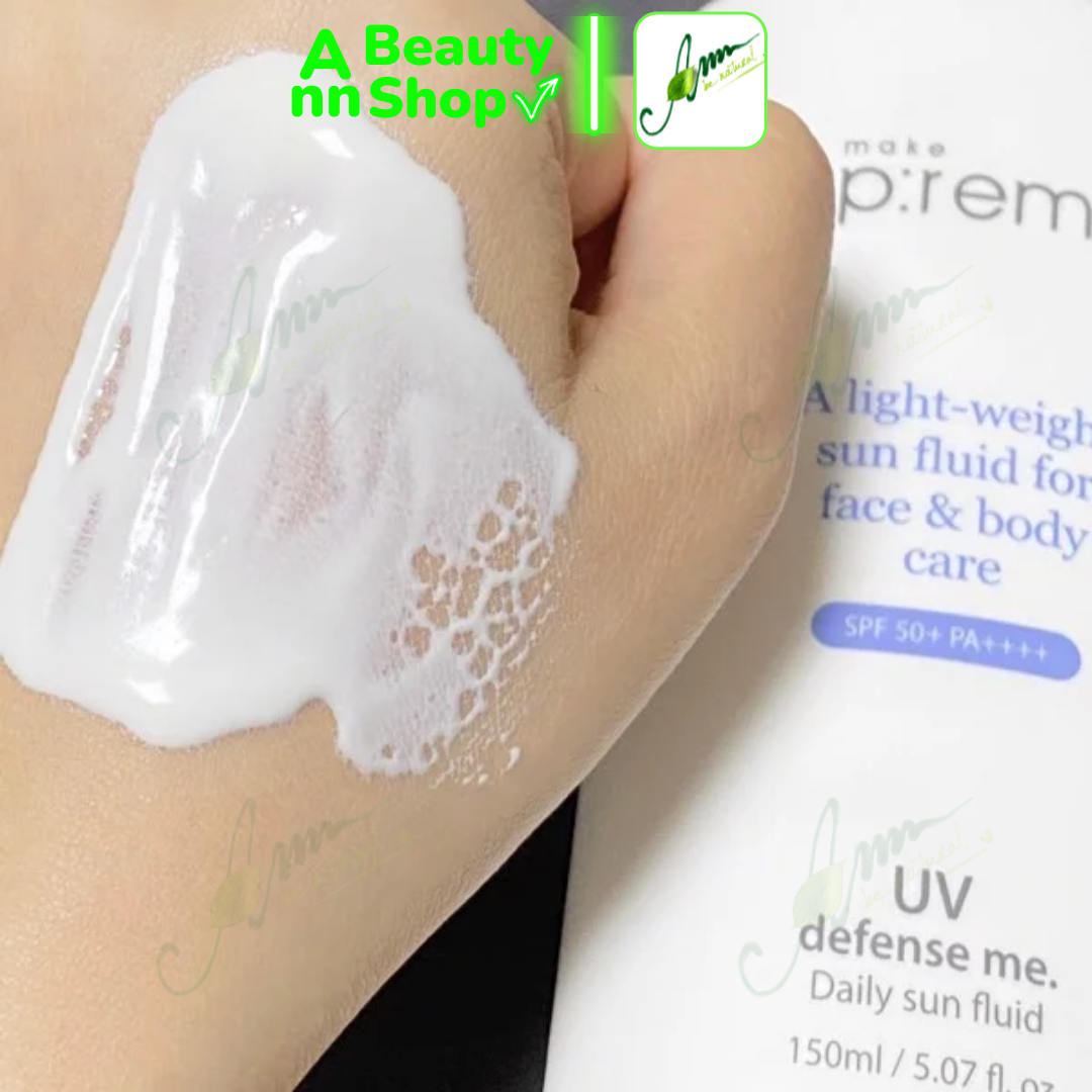 - Kem Chống Nắng Dạng Lai Make P:rem UV Defense Me. Daily Sun Fluid Mỏng Nhẹ SPF50+ PA++++ 150ml với sự kết hợp giữa màng lọc vô cơ và hữu cơ, đảm bảo làn da luôn được bảo vệ khỏi tác hại của tia UVA lẫn UVB. Kết cấu dạng sữa mỏng nhẹ, thẩm thấu nhanh, không bết dính mà vẫn cấp ẩm cho da.