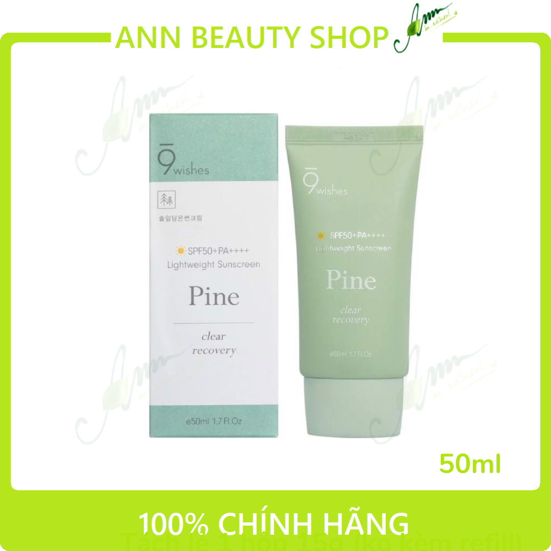 - Kem Chống Nắng 9 Wishes Pine Clear Recovery Treatment Sunscreen là kem chống nắng hóa học lai vật lý với chỉ số chống nắng đạt SPF50+/PA++++ giúp bảo vệ da tối ưu trước tác động của ánh nắng mặt trời trong suốt thời gian dài.