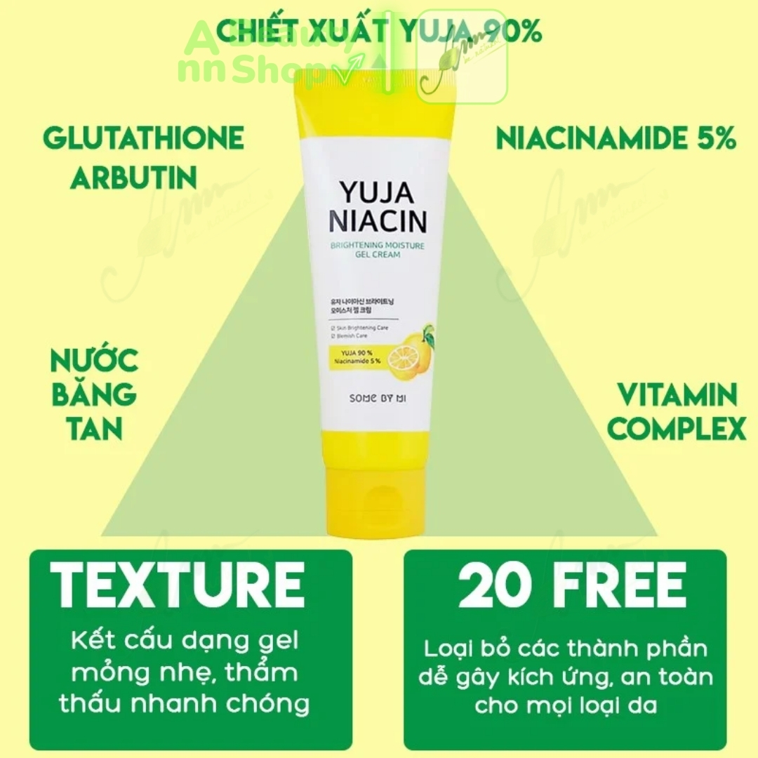 - Yuja Niacin Brightening Moisture Gel Cream không chứa hương liệu tổng hợp bạn ấy chứa tinh dầu thiên nhiên chiết xuất từ Yuja tươi - hương thơm đích thực của Yuja Và tất nhiên là tân binh mới của nhà Some By Mi phù hợp với mọi loại da, đặc biệt trên da dầu mụn vào mùa hè sắp tới này.