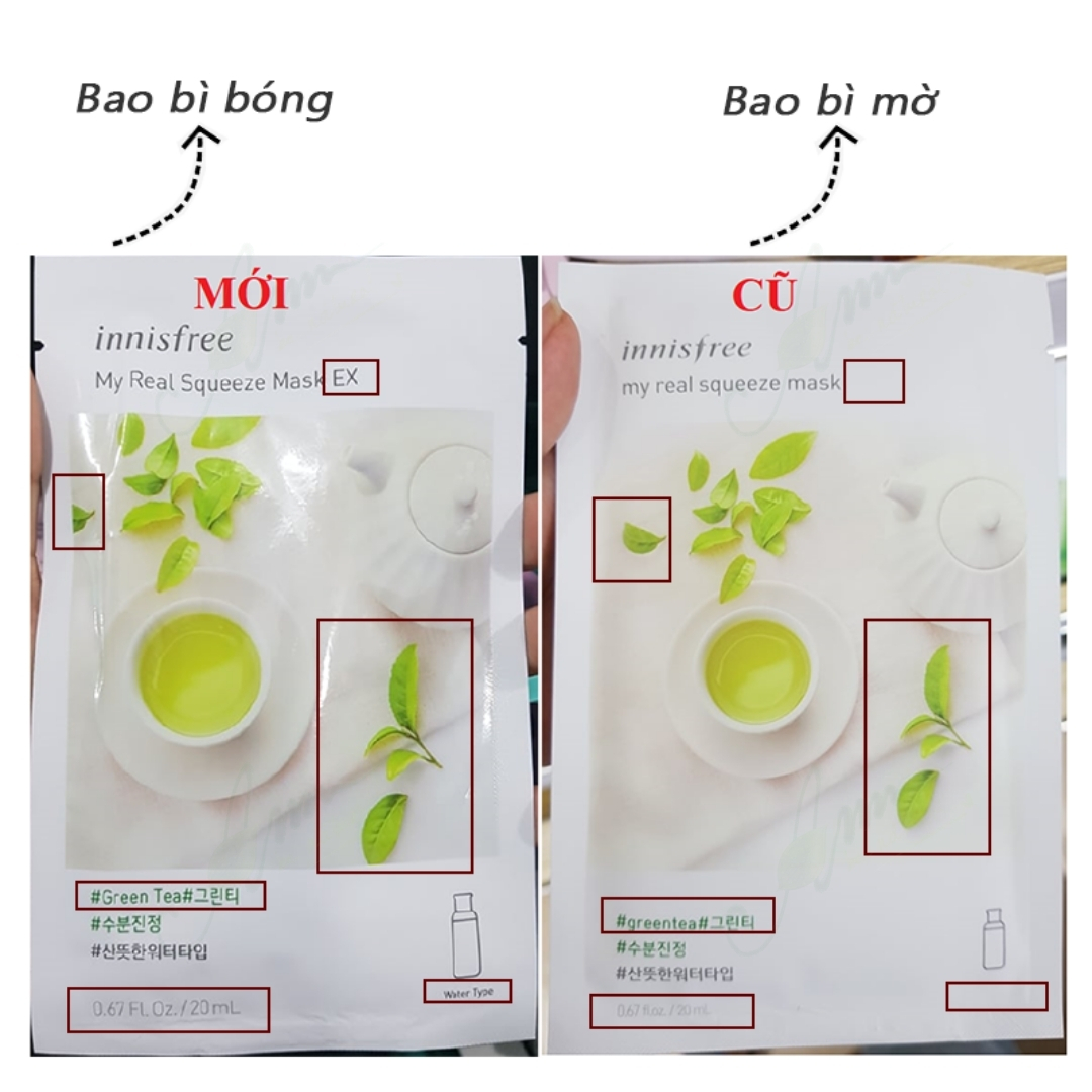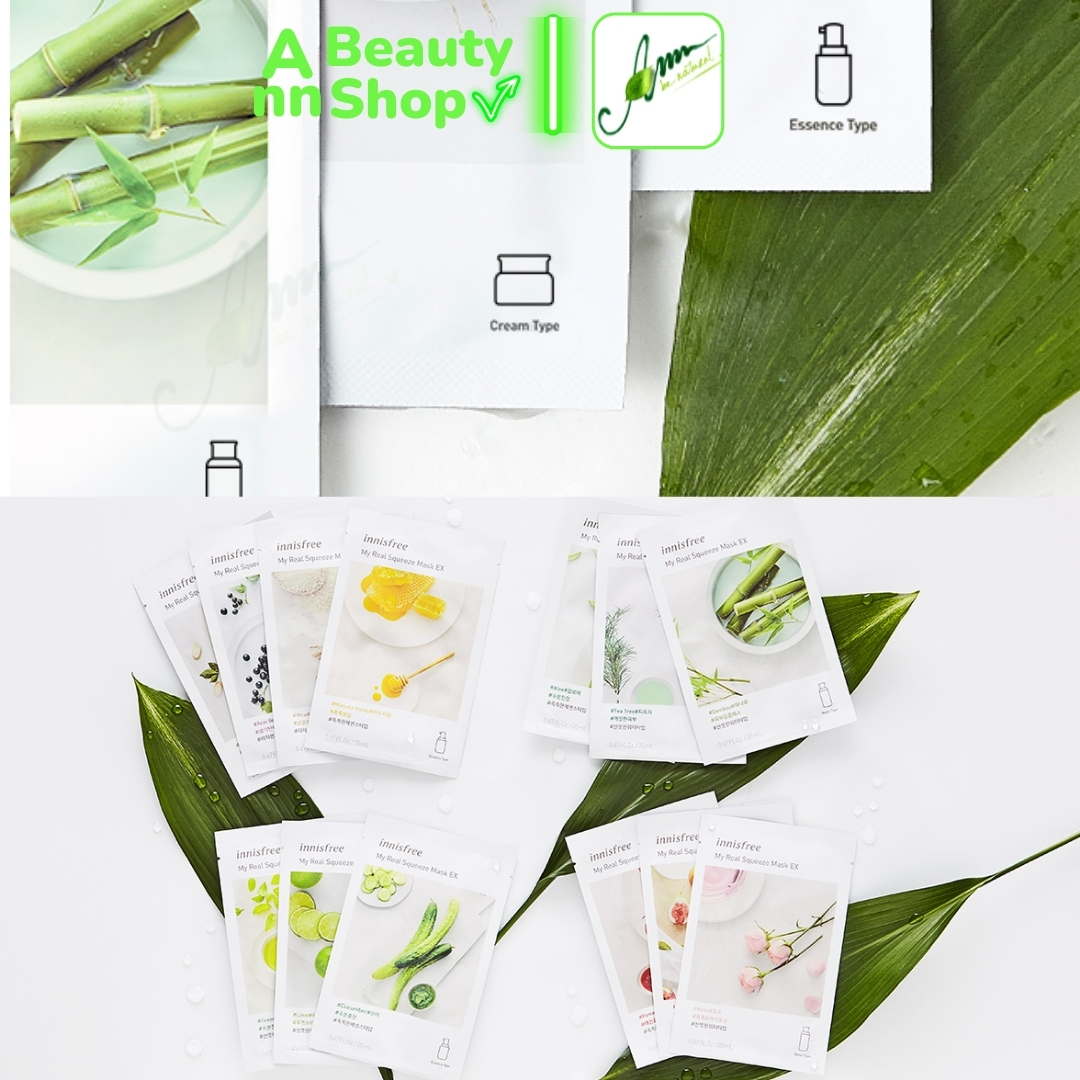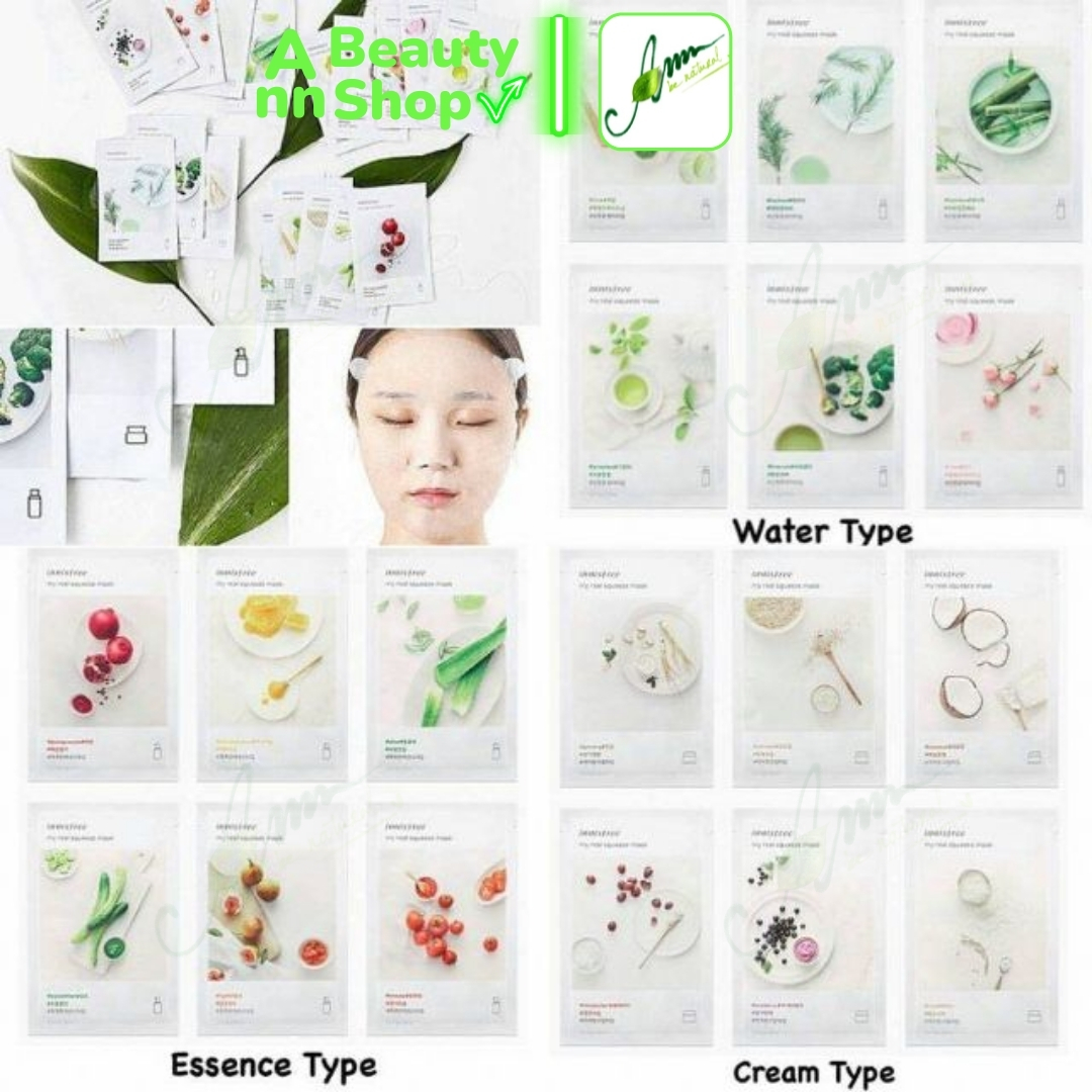 - Có nhiều loại để lựa chọn. Khi để ý trên bao bì mặt nạ Innisfree My Real Squeeze Mask sẽ thấy 3 kí hiệu có hình giống lọ kem, nước hoa hồng hoặc essence ám chị độ đậm đặc của dưỡng chất. Dù bạn không hiểu tiếng Hàn nhưng dựa vào những kí hiệu này giúp bạn lựa chọn ra tinh chất dưỡng phù hợp với tình trạng da của mỗi người.
