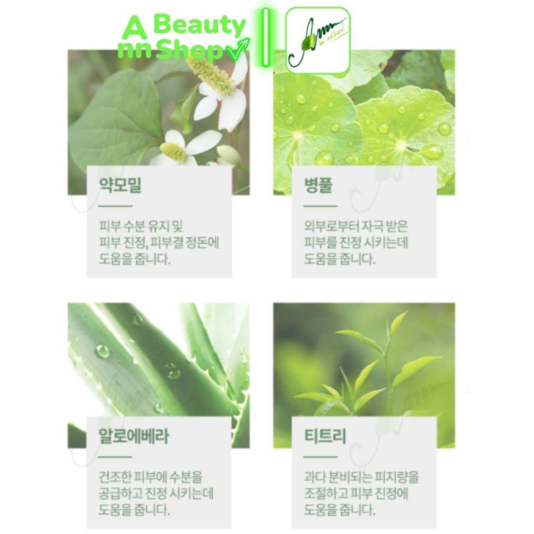 - Rau diếp cá duy trì độ ẩm, làm dịu da, điều chỉnh kết cấu da. Rau má làm dịu da bị kích ứng do kích ứng từ bên ngoài. Lô hội làm dịu và cung cấp dưỡng chất cho da khô. Tea tree điều chỉnh lượng bã nhờn bị điều tiết thừa, làm dịu da.