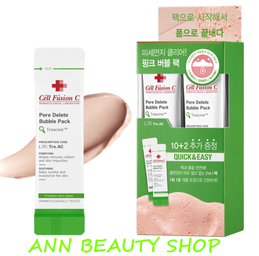 Mặt nạ sủi bọt Cell Fusion với thành phần chính là đất sét hồng kết hợp với lá trà xanh, cải bó xôi, quả đào... giúp làm sạch da nhẹ nhàng nhưng cực kì hiệu quả. Những bọt bóng bóng sẽ len lỏi vào sâu lỗ chân lông và cuốn theo bụn bẩn, bã nhờn trồi lên bề mặt da => lỗ chân lông sạch sẽ thì có cảm giác thu nhỏ lại => sản phẩm có tên là "pore delete" = xoá sạch lỗ chân lông