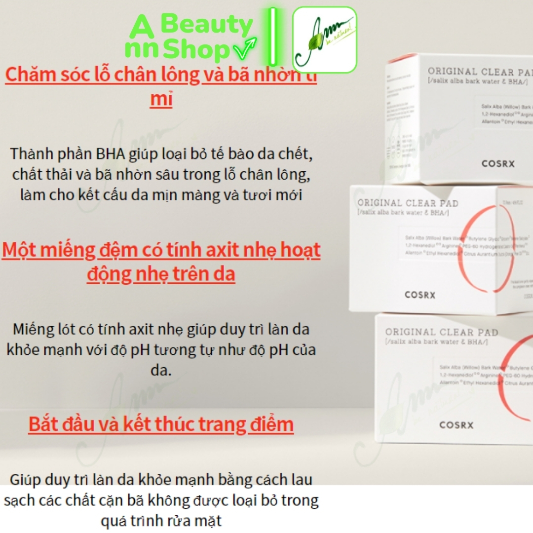 - Sản phẩm với những miếng bông được thấm trong dung dịch dưỡng chất từ thành phần cây liễu và BHA tự nhiên. Kết hợp từ hai bước tẩy tế bào chết và cân bằng da, sản phẩm tiện ích và dễ dàng sử dụng chỉ trong 1 miếng pad mà vẫn mang lại hiệu quả đáng mong đợi.