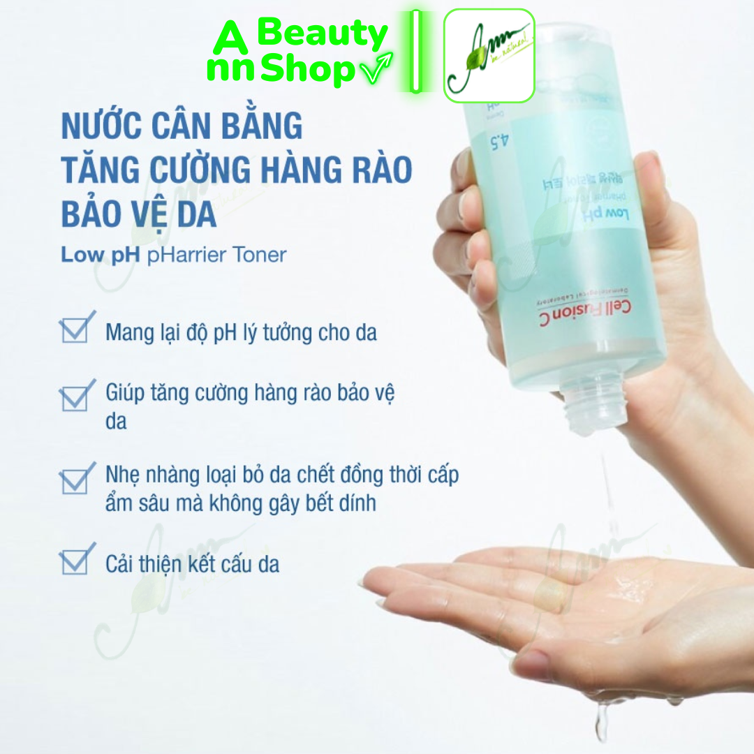- LOW PH PHARRIER TONER là sản phẩm toner mới nhất nhà CELL FUSION C với khả năng làm sạch sâu từ PHA nhưng vẫn đảm bảo không phả võ hay gây tổn thương hàng rào da với độ PH 4.5.