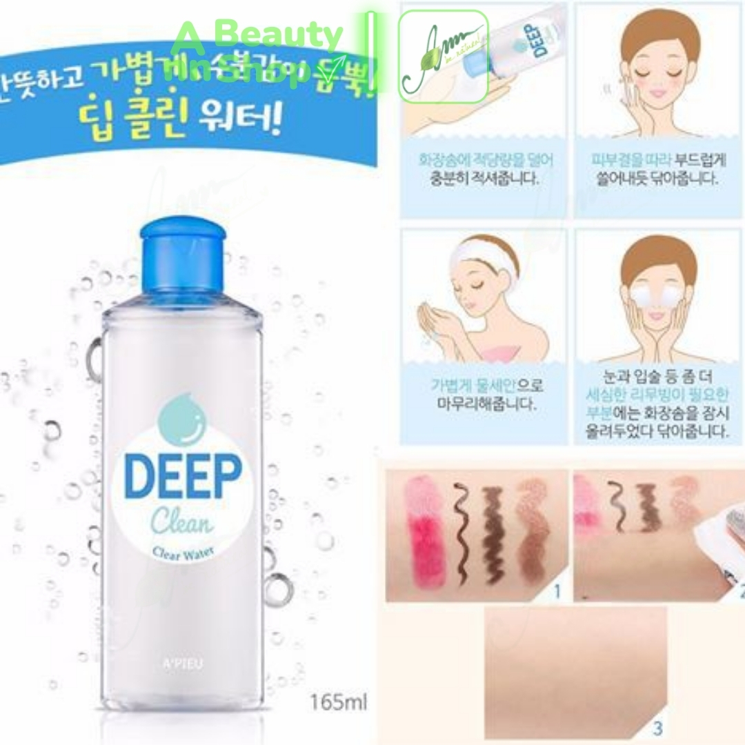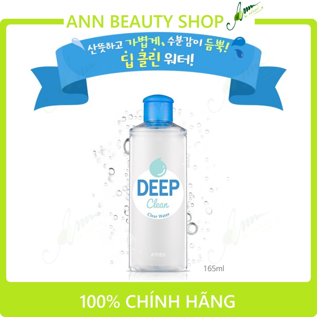 - Nước Tẩy Trang A'Pieu Deep Clean Clear Water (165ml) là nước tẩy trang giúp tẩy sạch bụi, chất bẩn sâu trong lỗ chân lông và cả lớp trang điểm một cách nhẹ nhàng với lớp nền là nước. Mang lại một làn da tươi mát và ẩm mượt. Tẩy trang thật nhẹ nhàng và tươi mát