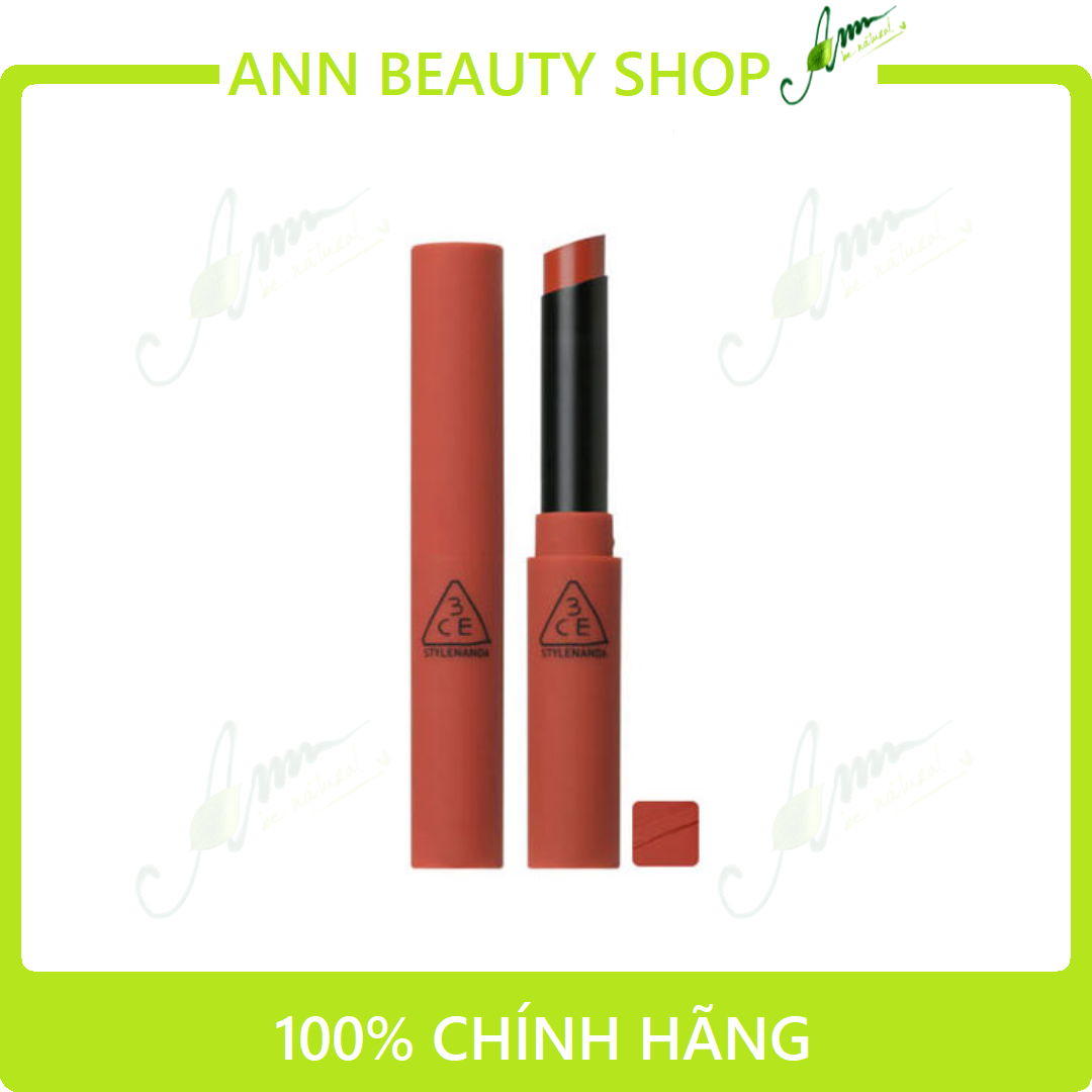 - 3CE Slim Velvet Lip Color là dòng son thỏi có chất son lì mịn như nhung, khi đánh lên môi sẽ có độ trơn mềm nhất định, chất son semi-matte mềm mại hơn dòng thỏi vuông của hãng 1 xíu, lớp finish siêu nhẹ
