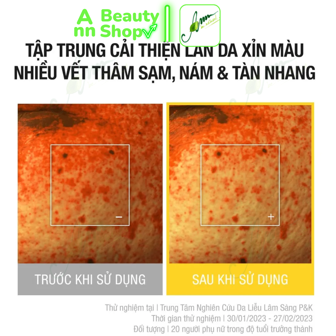 - Sản phẩm này giúp tăng cường kết cấu da, độ rạng rỡ, độ trong suốt và tính đồng nhất của các vết tàn nhang và vết thâm. Nó cũng có tác dụng làm sáng các vùng thâm nám.